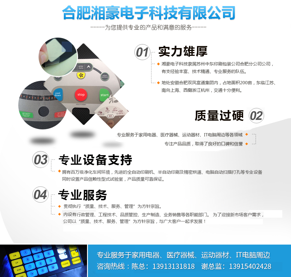 公司簡介 合肥湘豪電子科技有限公司系香港中意國際集團(tuán)股份有限公司(1998年創(chuàng)建)下屬企業(yè),關(guān)系企業(yè)有:東莞中意塑膠制品有限公司(1996年創(chuàng)建),蘇州中意塑膠制品有限公司(2003年創(chuàng)建),蘇州中東包裝印刷有限公司(2007創(chuàng)建),蘇州捷瑞達(dá)自動化科技有限公司(2014年創(chuàng)建),東莞唯道實(shí)業(yè)有限公司(2014年創(chuàng)建),合肥六九機(jī)器人自動化科技有限公司(2015年創(chuàng)建);合作企業(yè)有:香港富通工業(yè)集團(tuán)。 公司總部設(shè)在經(jīng)濟(jì)發(fā)達(dá)的香港,總公司這十幾年來先后在東莞,蘇州投資設(shè)廠,為滿足合肥市場廣大客戶的需求,總公司于2015年與香港富通工業(yè)集團(tuán)合作在合肥投資設(shè)廠,打造電器控制面板,薄膜開關(guān)業(yè)界的航空母艦,創(chuàng)造專業(yè)產(chǎn)品,樹立精品觀念,鍛造高品質(zhì)、高服務(wù)的企業(yè)形象,樹立正確的核心價值觀。全心全意為國內(nèi)外品牌企業(yè)服...榮譽(yù)資質(zhì)